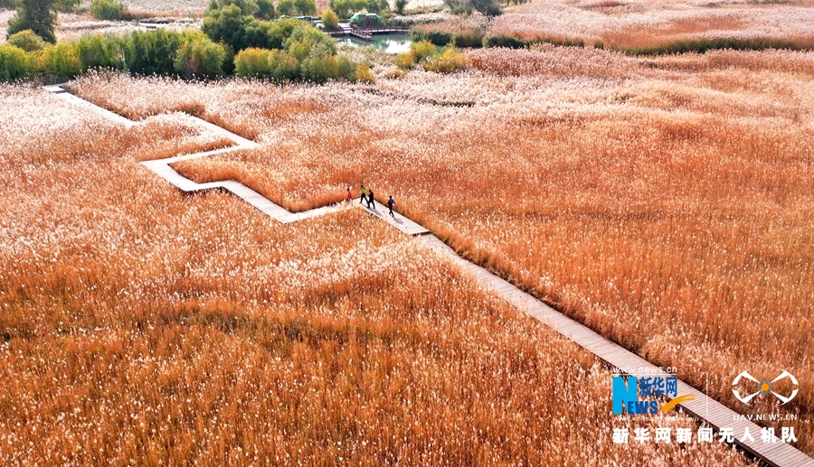 金秋时节,张掖国家湿地公园秋高气爽,苇花飘香,景色怡人,吸引游客打卡游览。