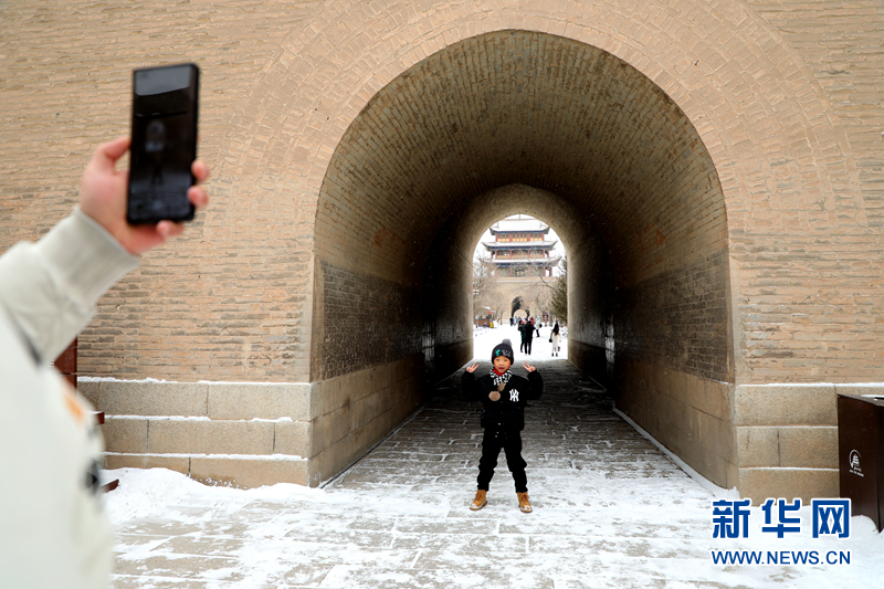 2月17日,游客在雪后的嘉峪关关城内拍照留影。新华网发(刘欣瑜 摄)