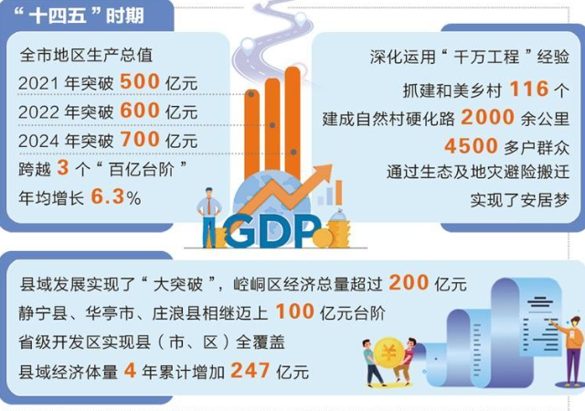 5年来,平凉经济总量实现了“三级跳”,全市地区生产总值2021年突破500亿元、2022年突破600亿元、2024年突破700亿元,跨越3个“百亿台阶”,年均增长6.3%,预计今年达到750亿元以上。县域发展实现了“大突破”,崆峒区经济总量超过200亿元,静宁县、华亭市、庄浪县相继迈上100亿元台阶,省级开发区实现县(市、区)全覆盖,县域经济体量4年累计增加247亿元。