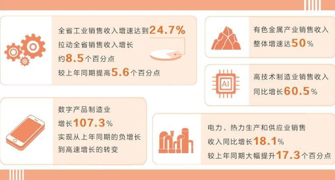 一季度,我省传统产业稳中有进,转型升级成效明显。有色金属产业销售收入整体增速达50%,其中,有色金属矿采选业增长57.9%,冶炼和压延加工业增长49.6%,较上年同期均实现翻倍增长;煤炭开采和洗选业、石化产业、中医药产业均由上年同期的负增长转为正增长,其中,煤炭开采和洗选业增长33.3%,石化产业整体增长3.6%,中医药产业整体增长13.4%。传统产业在技术升级和绿色转型中焕发出新活力。