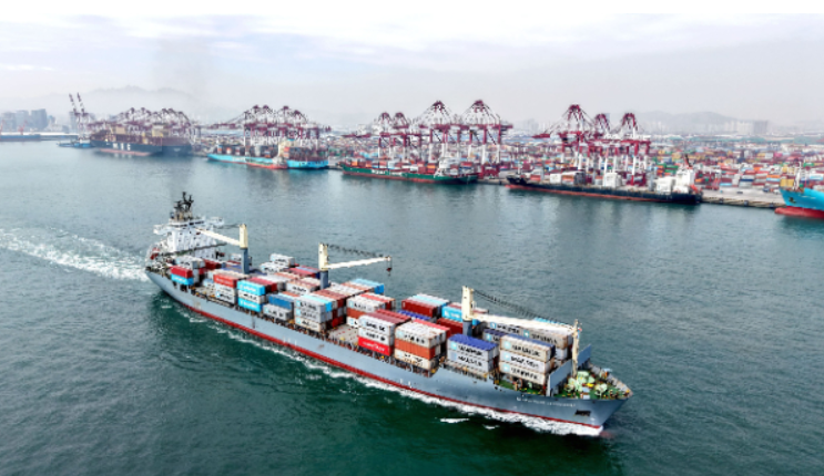图为4月14日,在山东港口青岛港,装载外贸集装箱的货轮驶离港口(无人机照片)。新华社发(俞方平 摄)