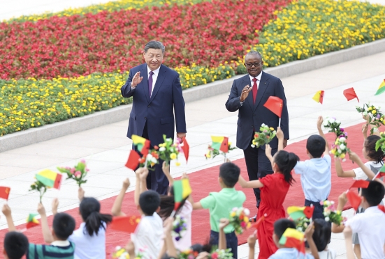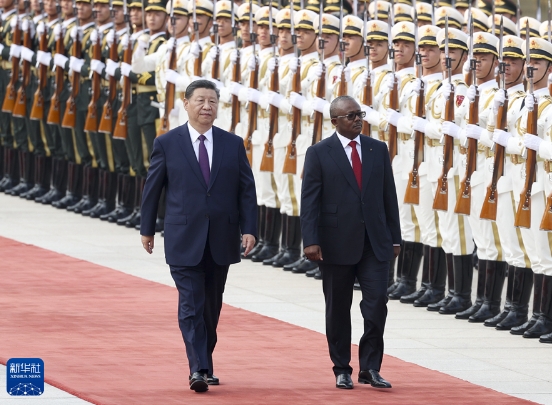 7月10日下午,国家主席习近平在北京人民大会堂同来华进行国事访问的几内亚比绍总统恩巴洛举行会谈。这是会谈前,习近平在人民大会堂东门外广场为恩巴洛举行欢迎仪式。新华社记者 饶爱民 摄
