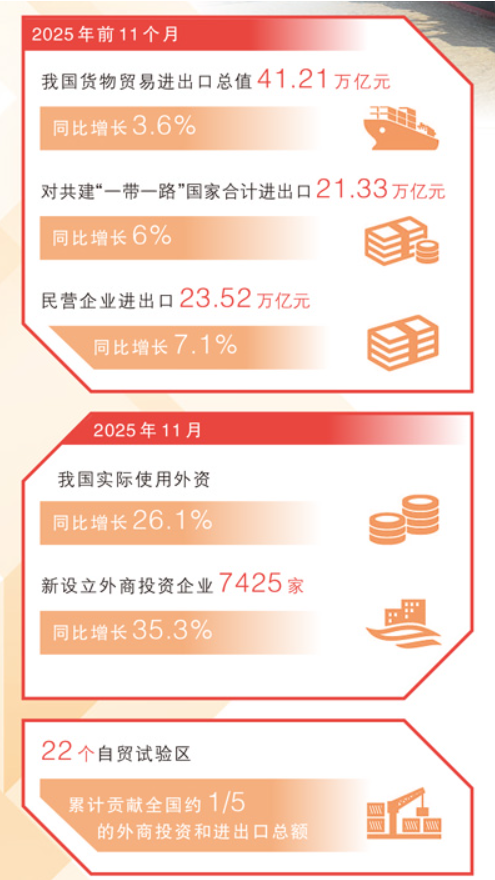 2025年,面对复杂严峻的外部环境,中国外贸逆势而上,实现量稳质升,以稳健的增长展现充沛的活力。2025年前11个月,我国货物贸易进出口总值41.21万亿元,同比增长3.6%。