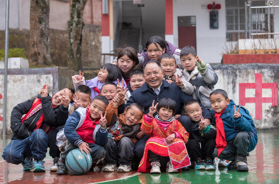 2025年2月18日,在云南文山壮族苗族自治州广南县,农加贵和学生们在落松地小学操场上合影。新华社发(彭奕凯摄)