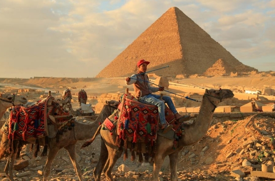 1月24日,商贩骑骆驼离开埃及吉萨金字塔景区。新华社记者 隋先凯 摄