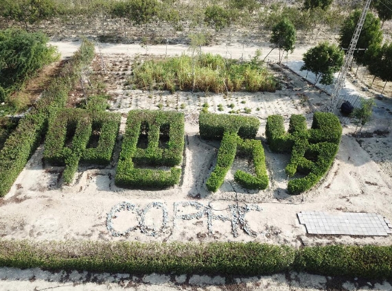这是在巴基斯坦瓜达尔的中巴友谊林中拍摄的桤果木修剪而成的“中巴万岁”立体字(无人机照片,9月15日摄)。