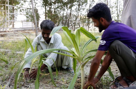 在巴基斯坦瓜达尔,园丁比拉尔·贾韦德(右)与同事在中巴友谊林给植物幼苗培土(9月15日摄)。