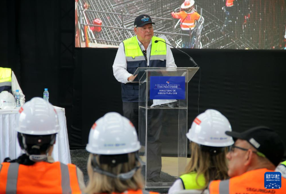 11月1日,在巴拿马首都巴拿马城,巴拿马公共工程部长何塞·路易斯·安德拉德在巴拿马运河第四大桥东主塔承台首层混凝土浇筑仪式上致辞。新华社发(巴拿马公共工程部供图)