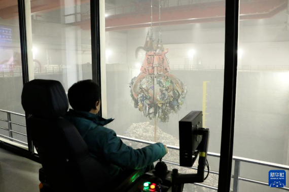 12月27日,在吉尔吉斯斯坦比什凯克,工作人员在比什凯克市垃圾焚烧发电项目垃圾吊控制室操作垃圾抓斗。新华社记者 江宥林 摄