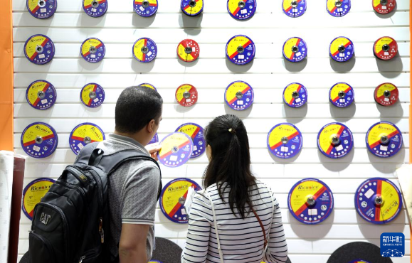 4月19日,采购商在广交会上参观选购磨砂轮。新华社记者 卢汉欣 摄
