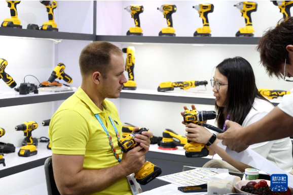 4月19日,采购商在广交会上参观选购电钻。新华社记者 卢汉欣 摄