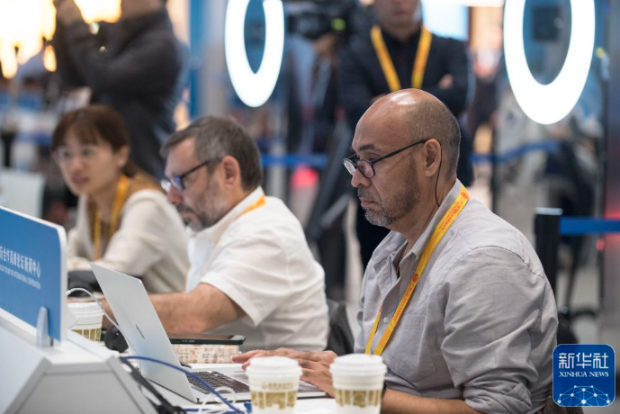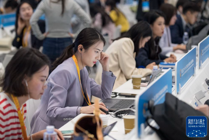 10月17日,记者在“一带一路”国际合作高峰论坛新闻中心工作。新华社记者 张豪夫 摄