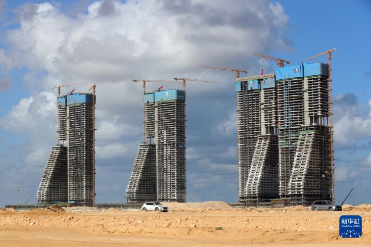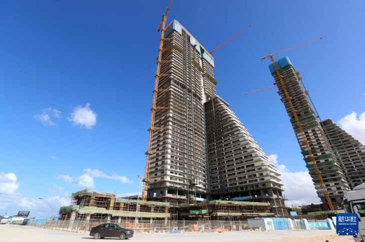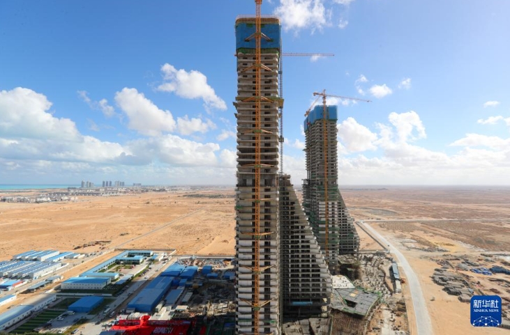 这是12月18日拍摄的埃及阿拉曼新城超高综合体项目率先封顶的D01住宅楼(左)。新华社记者 隋先凯 摄