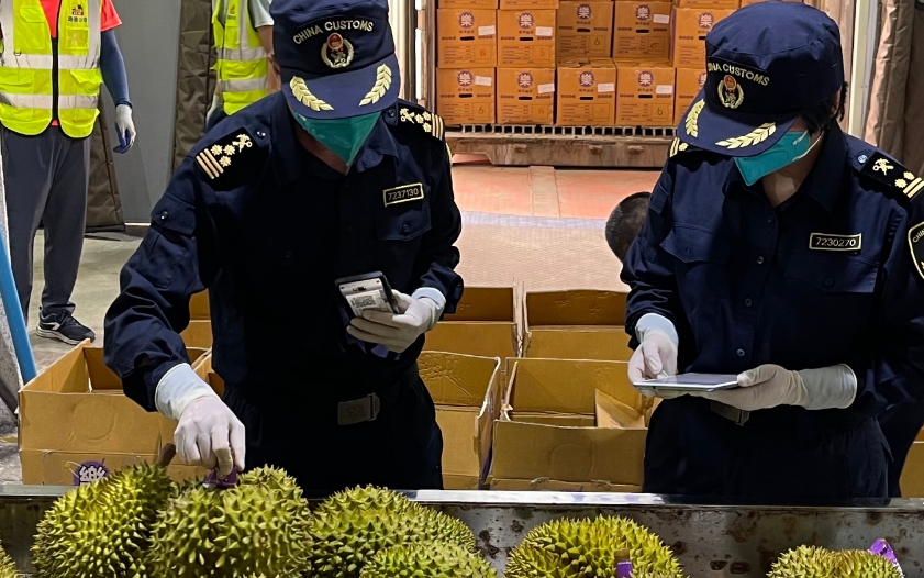 在广西友谊关口岸,工作人员在检查进口榴莲(2023年4月21日摄)。新华社记者 聂新宇 摄