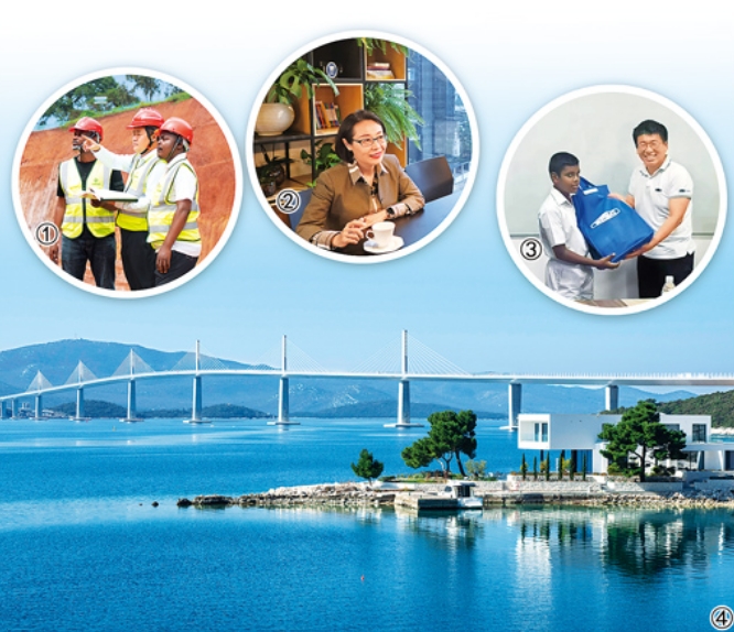 图①:张林(中)在施工现场为属地员工传授工程技术。图②:胡志敏在工作。图③:李强(右)为孩子发放爱心书包。图④:由中交集团建设的克罗地亚佩列沙茨大桥实现了该国南北联通的梦想。