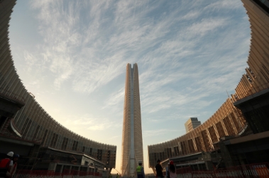 这是2023年11月22日在埃及开罗以东拍摄的埃及新行政首都中央商务区的标志塔(中)。新华社记者 隋先凯 摄