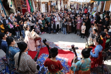 1月24日,在摩洛哥首都拉巴特老城,人们欣赏民乐表演。新华社记者 霍晶 摄