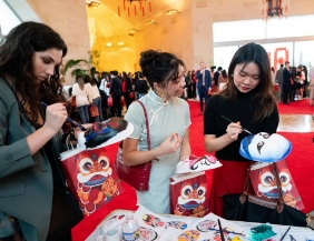 1月28日,在位于美国华盛顿的中国驻美国大使馆,青年学生在中美青年新春联欢活动上体验画脸谱。新华社记者刘杰摄