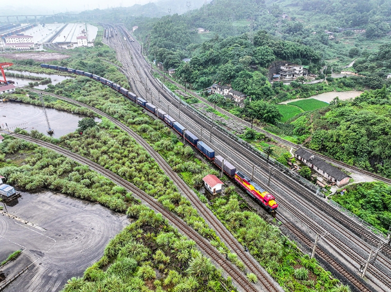 2024年6月27日,西部陆海新通道中老泰马跨境铁路班列在重庆江津小南垭站发车(无人机照片)。新华社记者唐奕摄
