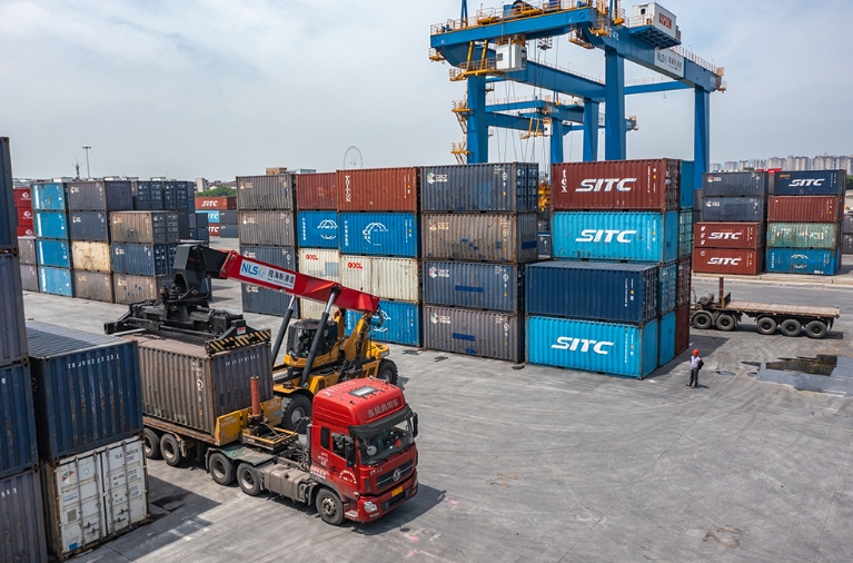 2024年5月5日,在重庆国际物流枢纽园区,转运卡车在陆海新通道重庆无水港转运集装箱(无人机照片)。新华社记者黄伟摄