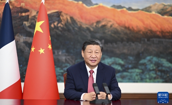 1月25日,中法建交60周年招待会在国家大剧院举行,国家主席习近平发表视频致辞。