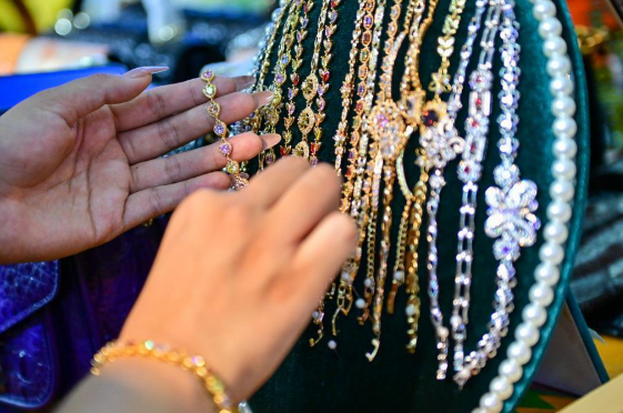 27 июня 2024 года, посетитель выбирает браслет на стенде Ганы на 8-м ЭКСПО "Китай-Евразия" в Урумчи. /Фото: Синьхуа/