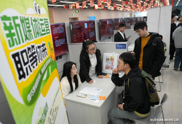 2 апреля 2026 года, на ярмарке вакансий для выпускников вузов в городе Ханчжоу провинции Чжэцзян /Восточный Китай/ соискатели и представители предприятий обсуждают возможности трудоустройства. /Фото: Синьхуа/