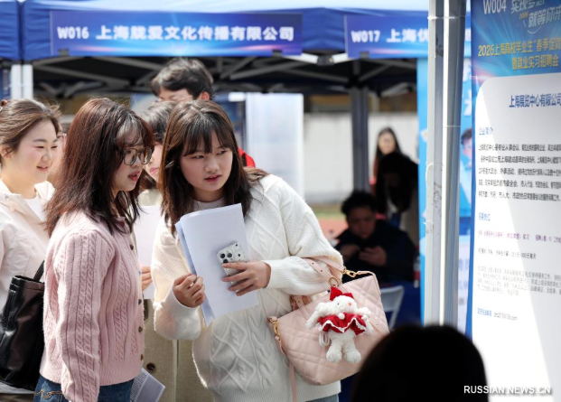 31 марта 2026 года на ярмарке вакансий и стажировок для выпускников вузов в городе Шанхай /Восточный Китай/ соискатели знакомятся с информацией о вакансиях. /Фото: Синьхуа/